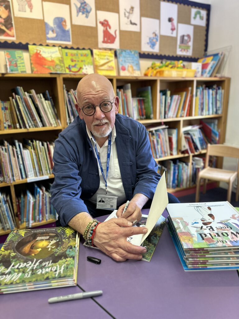 In Reception, the children decorated their own butterflies inspired by As the World Goes By. The story follows a dog called Buttons, who spots a beautiful butterfly and wants everyone to stop and notice it. When they finally do, they all share in the beauty of the butterfly’s wings together. Jonny shared that Buttons is based on his own working cocker spaniel, also called Buttons. The children then enjoyed listening to the story read by Johnny himself, along with other favourites including Can You Share, Little Whale? and Look Out! It’s a Dragon!.
